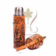 Термос походный 1л в оплетке из натуральной кожи с гравировкой изображения.