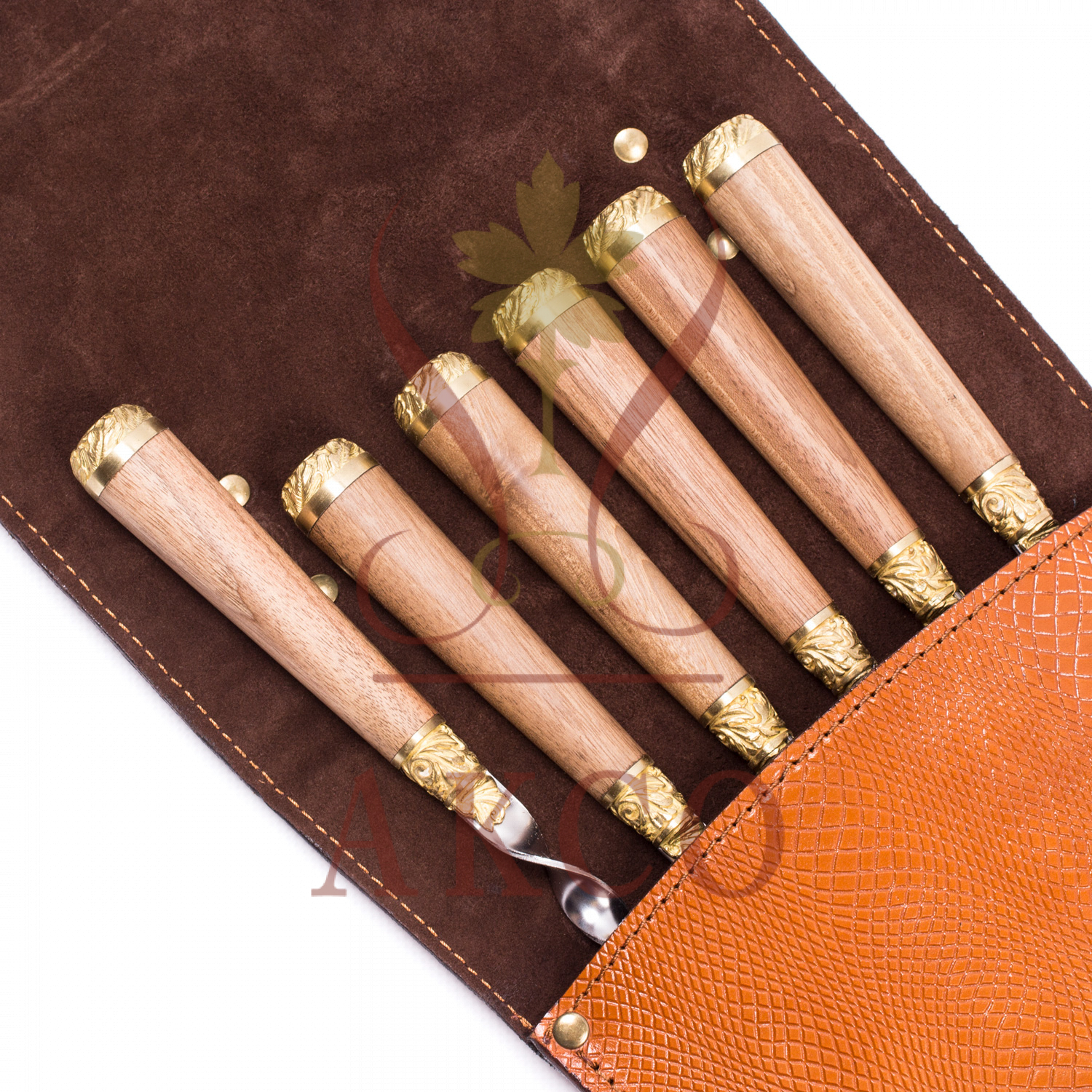 - Наборы подарочных шампуров с рукоятью из дерева и латуни в колчане с гравировкой изображения