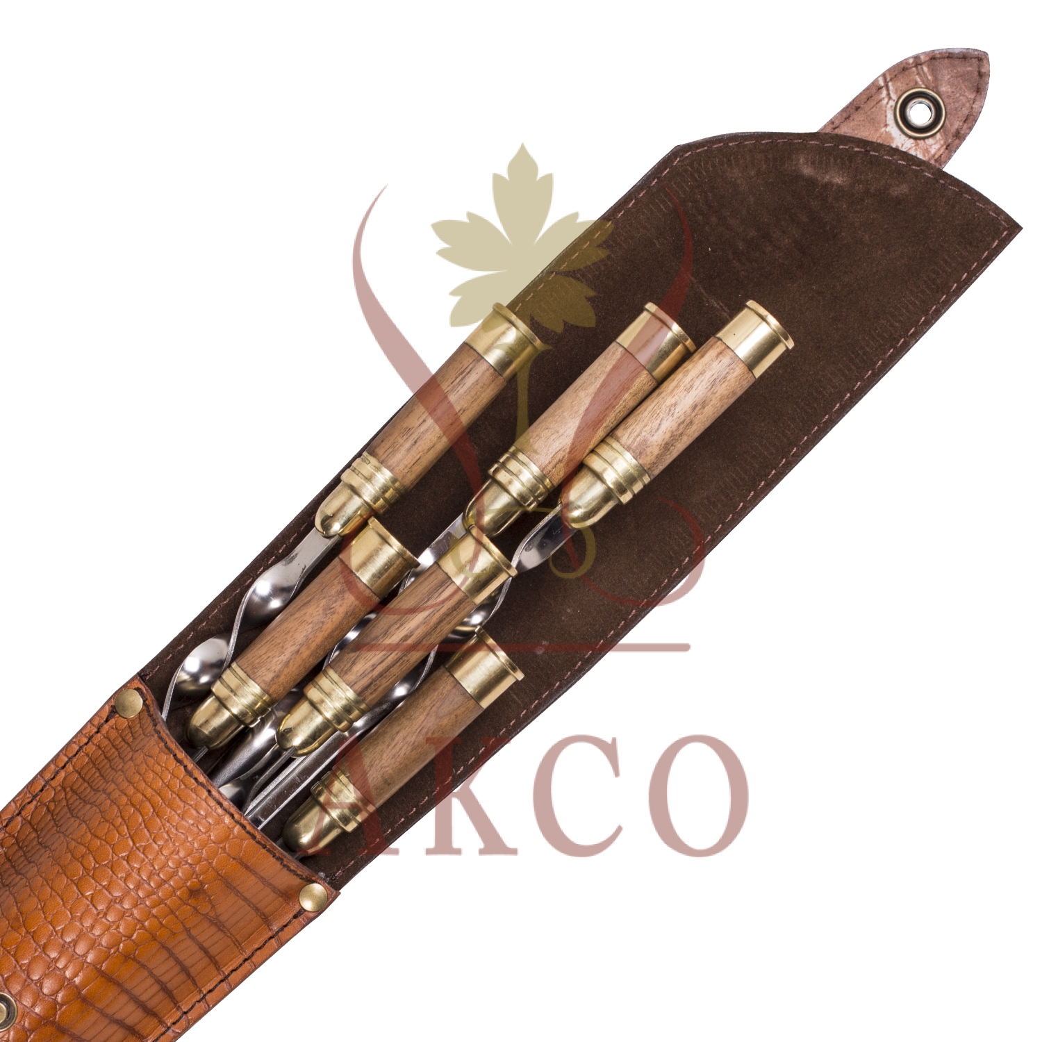 - Наборы подарочных шампуров с рукоятью из дерева и латуни в колчане с тиснением изображения